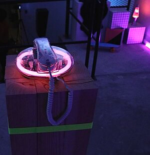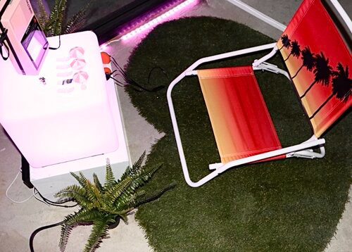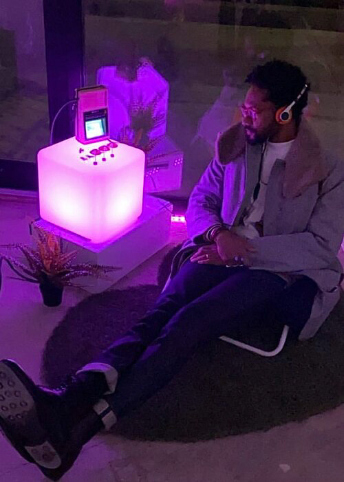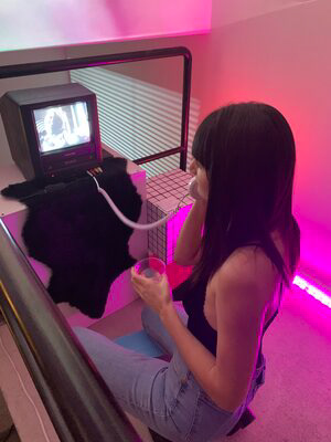 Caitlin filmed, starred in, and edited each piece. The videos were then streamed into a custom-built, original retro setting.
